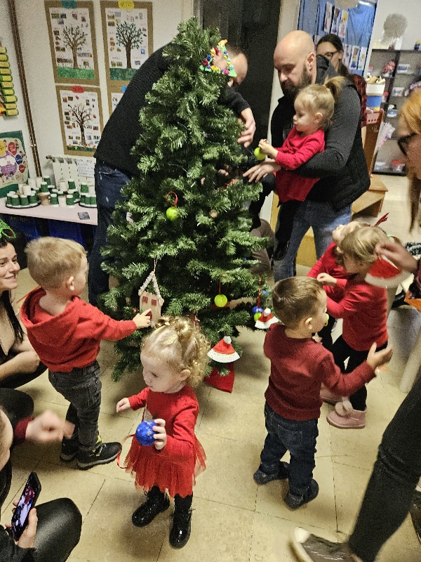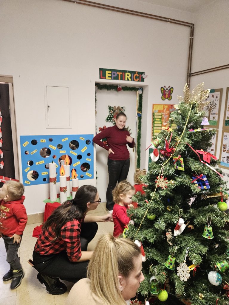 Ovo predblagdansko vrijeme upotpunili smo i zaokružili kićenjem božićnog drvca koji krasi hodnik našeg vrtića, skupa sa roditeljima. Uz pjesmu i ples stvorila se topla, božićna atmosfera i osjećaj zajedništva.