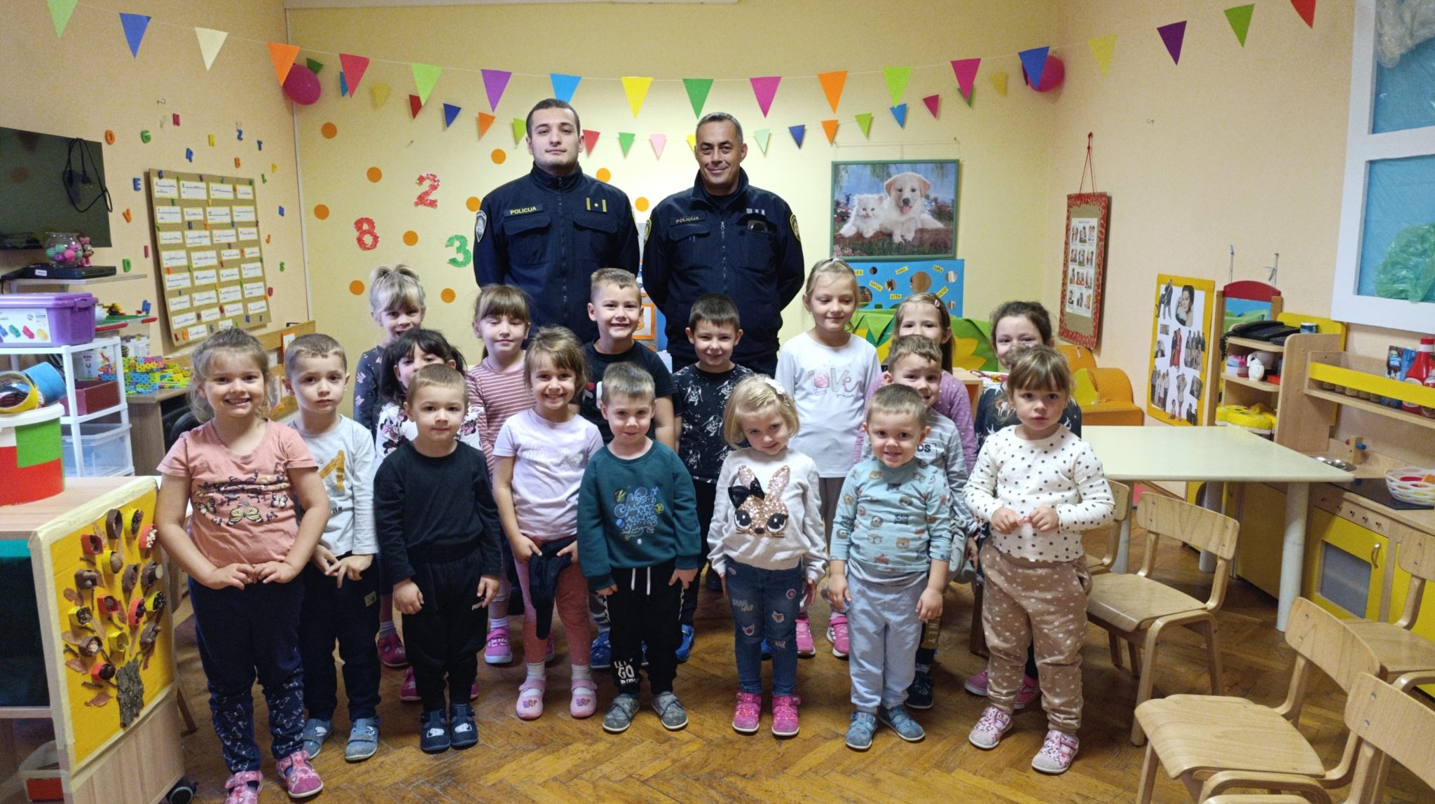 Povodom obilježavanja Dana policije u goste nam je došlo dvoje policijskih službenika iz PP Ogulin. Policajci, gosp. Dario i gosp. Josip, pobliže su nas upoznali s djelatnošću koju obavljaju, podsjećajući nas na spoznaje koje smo stekli prošlogodišnjom posjetom PP Ogulin. Isprva malo sramežljivi „Leptirići“ su krenuli postavljati pitanja na koja su nam ljubazni policijski službenici rado odgovarali. Zatim smo se upustili u razgovor kako se treba pravilno ponašati u prometu. Poziv policijskih službenika da djeca izađu van razgledati njihovo službeno